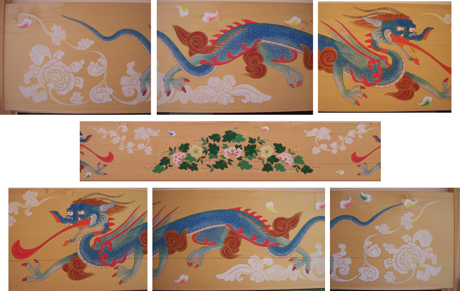 虹梁に彩色 岩絵具、金、墨