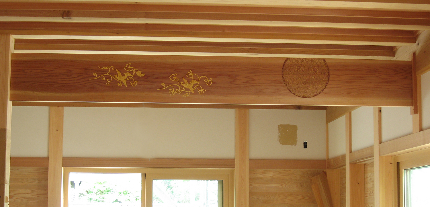 表は幸せを運んでくる花喰鳥と、裏は永遠や繁栄を表す唐草の宝相花 表裏の円形は太陽と月をイメージしました。 事務所の装飾という事もあり、スッキリと見えるよう心がけました。