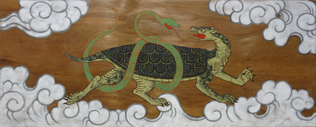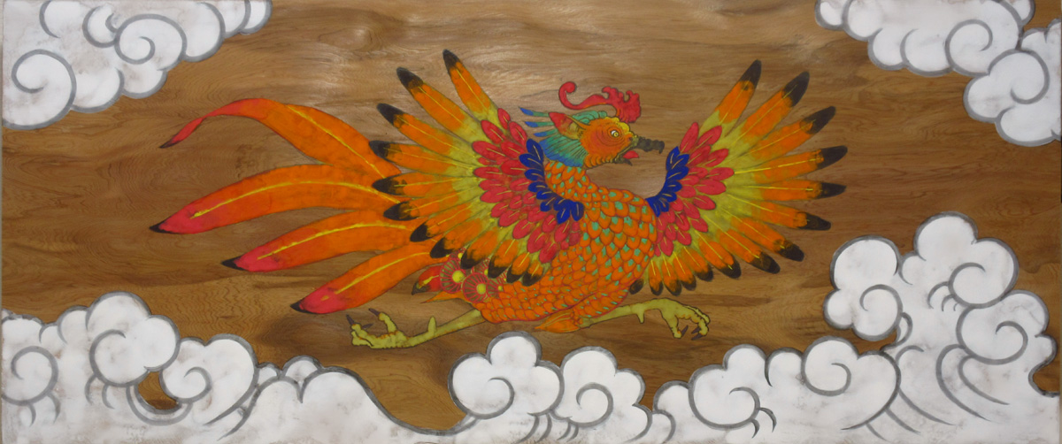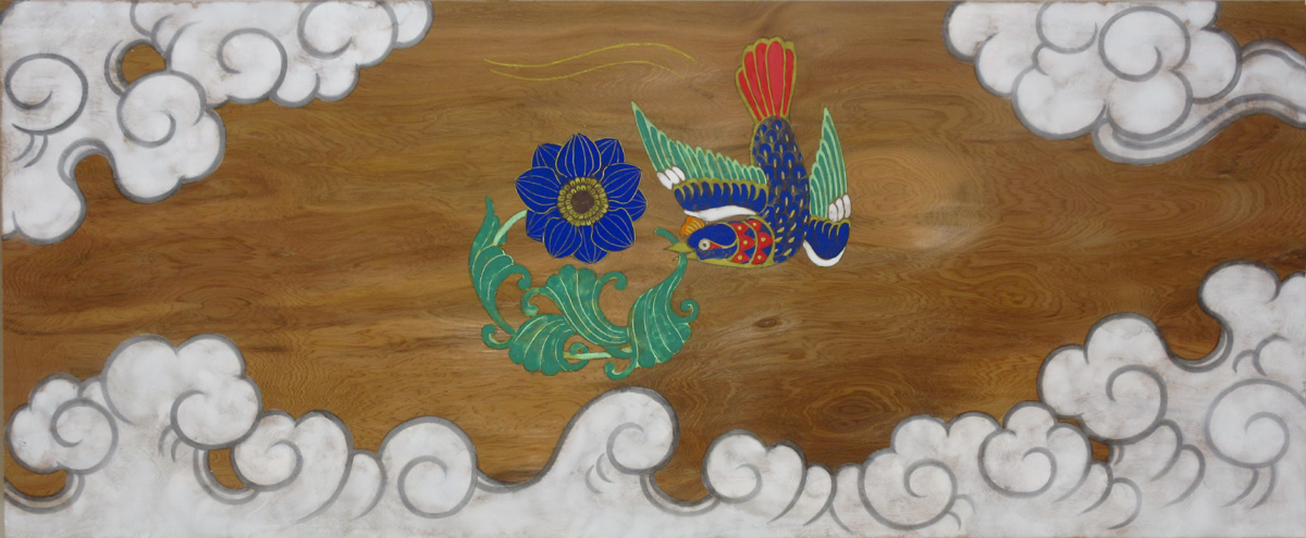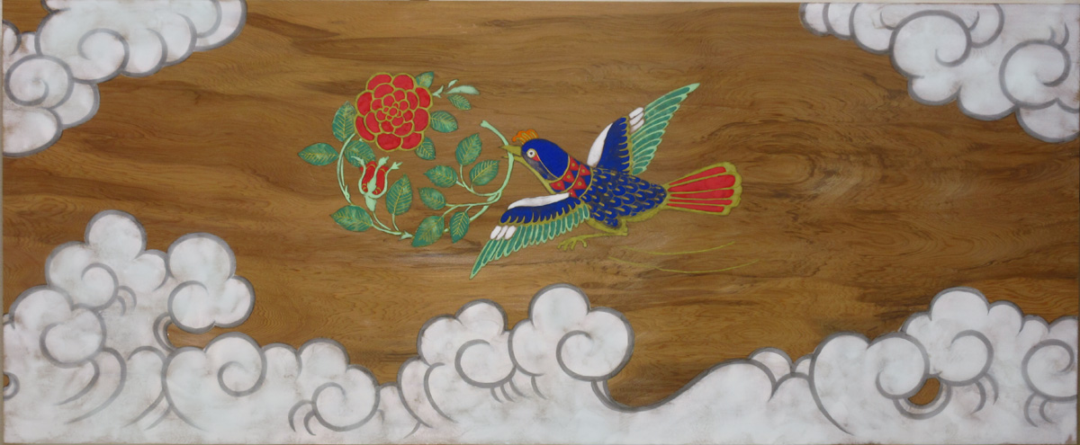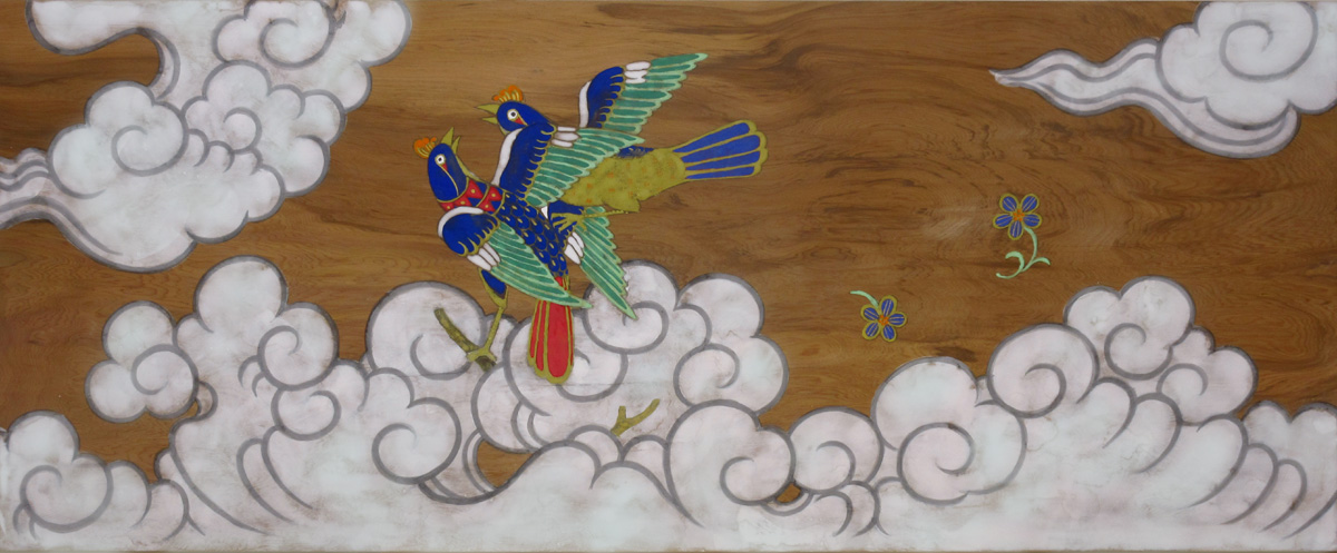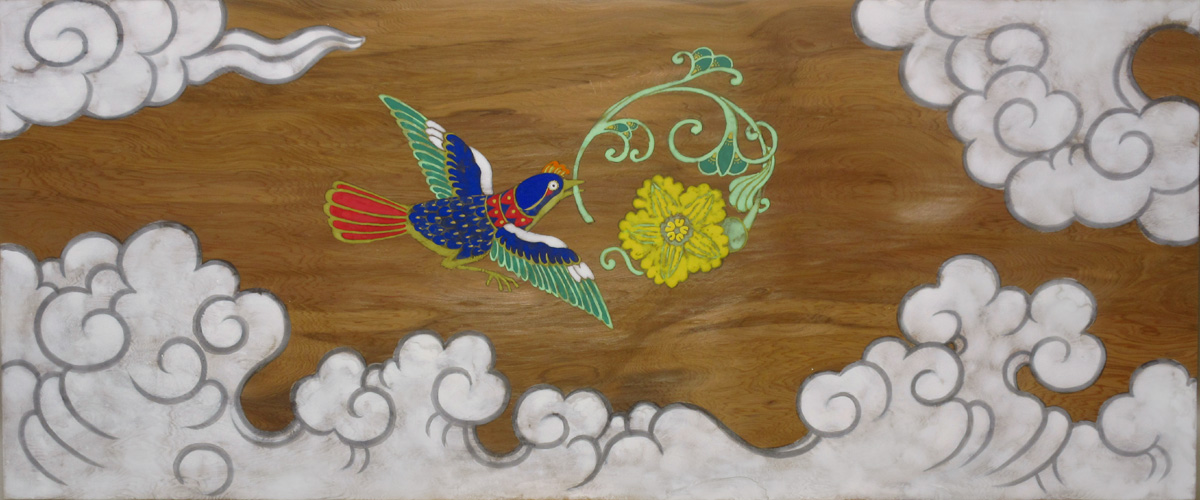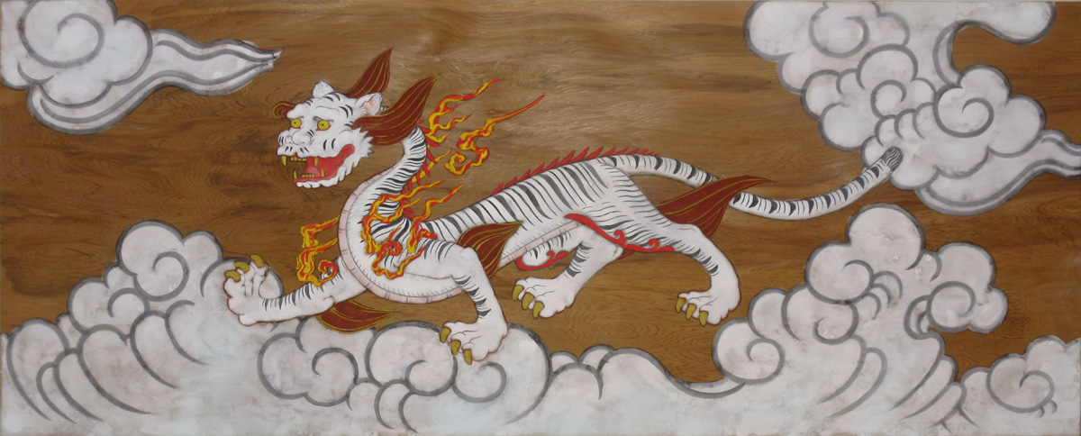 彩色板絵幕板 寸法 W1120×H448(mm) (3尺7寸×1尺4寸8分) 屋久杉、金、岩絵の具、墨